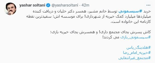 برخی از کاربران با انتقاد از رفتار دوگانه نهادهای نظارتی با مسئولان نظام، نحوه مواجه با سفر خارج از کشور دختر علی لاریجانی برای درمان و تحصیل را با سفر دختر قالیباف برای خرید سیمونی به ترکیه مقایسه کرده و از آن انتقاد کردند. بهروز عزیزی فعال رسانه ای نوشت «لاریجانی چون دخترش برای درمان به خارج از کشور رفته بود اشرافی است، اما جناب قالیباف که سیسمونی را از ترکیه میخرد انقلابی است»