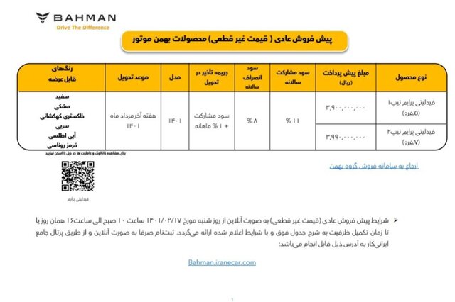 گروه بهمنموتور در نظر داشت که چهارشنبه هفته گذشته (۱۴ اردیبشهت ماه) محصول فیدلیتی پرایم را پیشفروش کند اما با توجه به تغییر روز عید، بنا بردرخواست مشتریان، زمان ثبتنام و در شرکت در این طرح، به تعویق و به امروز (شنبه) موکول شد.
